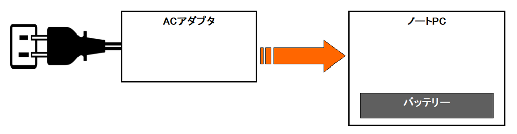 使用中にACアダプタをコンセントから抜いてしまったらどうなるでしょうか?ACアダプタで使用しているのですからACアダプタからの電源が落ちたらノートPCの電源もOFFしそうなものですが、実際はそうではなく(バッテリーに残量が十分有れば)ノートPCを使い続けることができます。