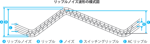 整流やスイッチング動作に起因して比較的低周波で現れる成分をリップル成分と呼び、スイッチング素子の高速動作などによって発生する高周波成分をノイズ成分と呼びます。