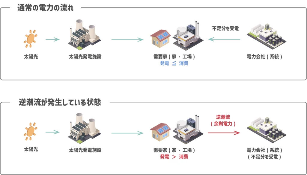 逆潮流とは、太陽光発電などで発電された電力を、系統連系を通じて商用電力系統へ送り返すことを指します。