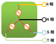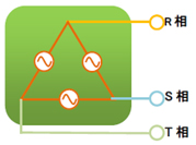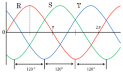 三相の各相(R, S, T)は下図のように位相が120度ずれており、切れ目無く電力エネルギーを供給できるようになっている。
